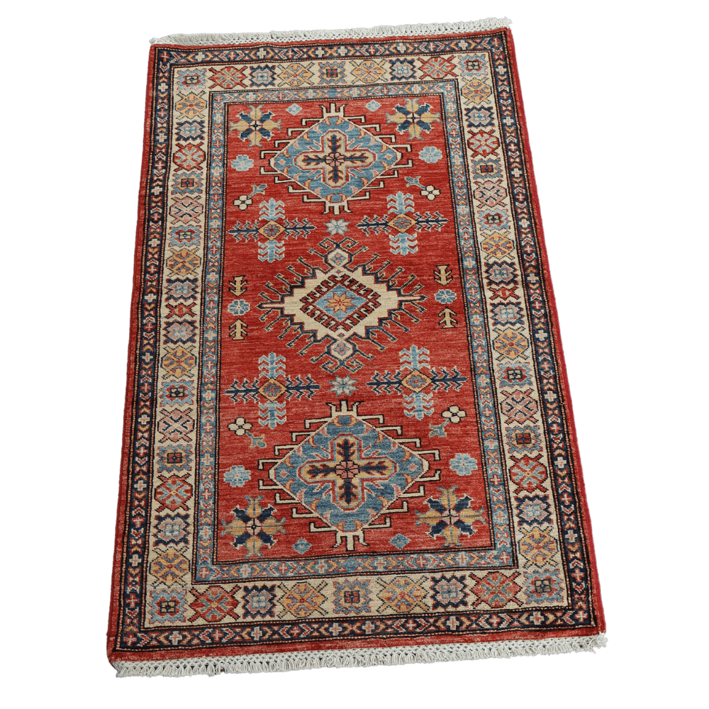 The classic Kazak hand-knotted rug with rich borders exudes timeless elegance and craftsmanship. Featuring bold geometric patterns in vibrant shades of red, blue, and ivory, this rug is adorned with intricate borders that highlight the artistry of Kazak weaving traditions. Made from durable, high-quality wool, this rug is soft underfoot and built to withstand the test of time. Its striking design and cultural significance make it a perfect addition to both traditional and contemporary spaces, adding warmth, sophistication, and a historical touch to your home.