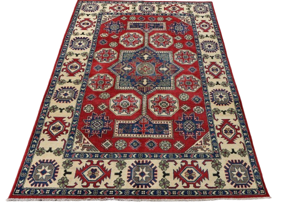 This Kazak hand-knotted wool rug with traditional patterns is a beautiful fusion of artistry and heritage. Expertly woven by skilled artisans, the rug features classic geometric shapes and symbolic motifs in a striking color palette of vibrant reds, deep blues, and creamy ivories. The high-quality wool offers both softness and durability, making it perfect for high-traffic areas while adding a touch of luxury to your home. The timeless design and cultural richness of this rug make it a standout piece, enhancing the warmth and elegance of any space with its distinctive and bold aesthetic.